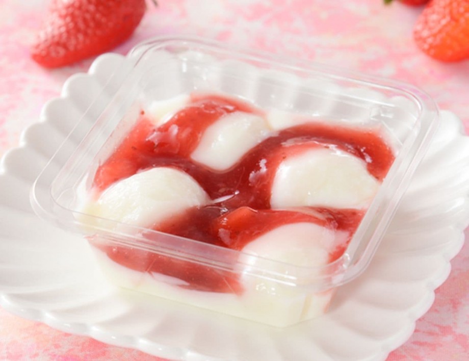 もちもちつるんとした食感のミルクもちに、とろ~りとした練乳といちごソースを合わせた仕立て。