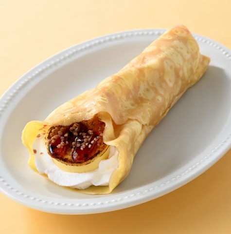 香ばしくブリュレしたカスタード生地がのったクレープ。バナナ、カラメルソース、食感のあるカラメルチップを包んでおり、最後まで飽きずに食べられる。378円。