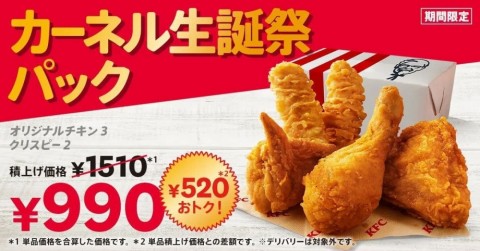 「カーネル生誕祭パック」は、オリジナルチキン3ピース、カーネルクリスピー2個入り。単品積上げ価格1,510円のところ990円(税込)。