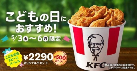 ケンタッキー「こどもの日9ピースバーレル」オリジナルチキン9個入りで500円お得!4日間限定 (参照記事: えん食べ)