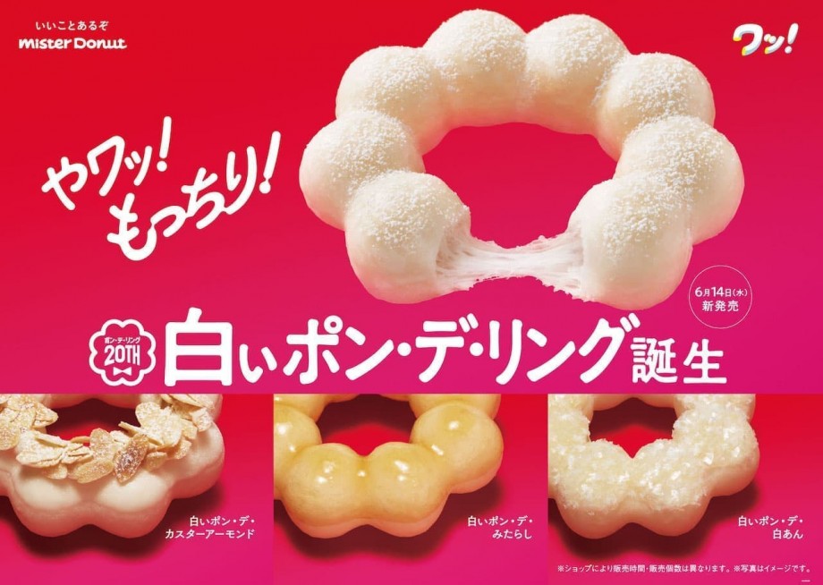 ミスド「白いポン・デ・リング」ポン・デ・リング20周年記念!「白いポン・デ・カスターアーモンド」や「白いポン・デ・白あん」など全4種 (参照記事: えん食べ)