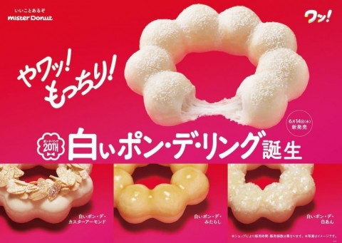 ミスタードーナツから、「ポン・デ・リング」20周年を記念した新商品「白いポン・デ・リング」全4種が、6月14日より販売されている。期間限定。価格は税込み。