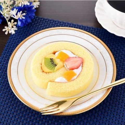 パティスリーキハチ監修のロールケーキ。ふわふわのスポンジで、5種のフルーツとカスタードクリーム、北海道産生クリームをブレンドしたホイップクリームが巻かれている。