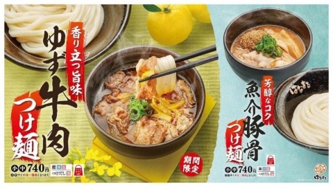 全国のはなまるうどんで、「ゆず牛肉つけ麺」と「魚介豚骨つけ麺」が、4月4日から期間限定で発売される。