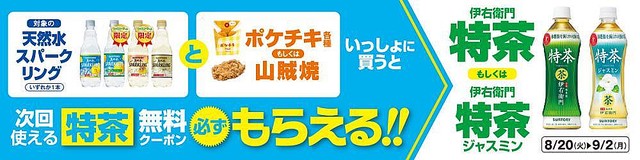 全国のファミリーマートで8月20日~9月2日の期間、ポケチキか山賊焼と対象の天然水スパークリングいずれか1本をいっしょに買うと、次回使える特茶の無料クーポンが必ずもらえる。