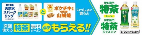 「伊右衛門特茶(500ml)」と「伊右衛門特茶 ジャスミン(500ml)」(それぞれ183円)のいずれか1本と交換できるクーポンがもらえる。