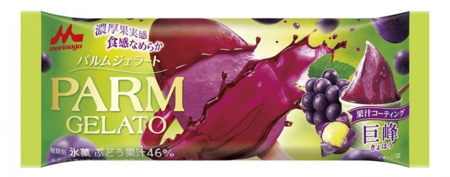 昨年発売し好評だった、夏限定「PARM(パルム)」ジェラートシリーズの第二弾。夏らしい果実のジューシーな味わいと「PARM(パルム)」らしい“はむっと食感”に加え、お店で手作りしたジェラートのようなねっとり&なめらかな食感が楽しめる。ぶどう果汁が46%使用されている(ぶどう果汁中の56%が巨峰果汁)。