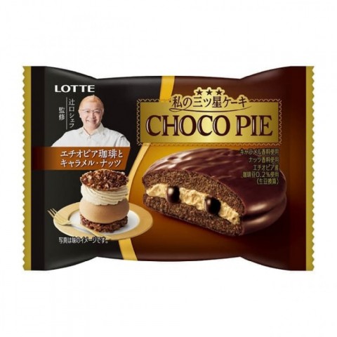 辻口博啓シェフ監修のチョコパイ。キャラメル・ナッツクリームの中にエチオピア珈琲ソースをサンドしてある。ナッツのロースト感とほろ苦い珈琲の程よいバランスで、上品な味わいの商品。