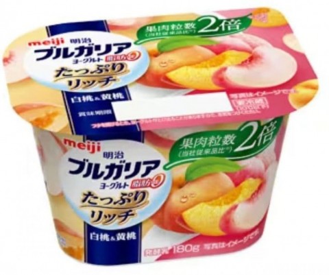 「明治ブルガリアヨーグルト脂肪0 たっぷりリッチ 白桃&黄桃」白桃・黄桃の果肉を従来品の2倍配合!食べごたえたっぷりでも “脂肪ゼロ” (参照記事: えん食べ)
