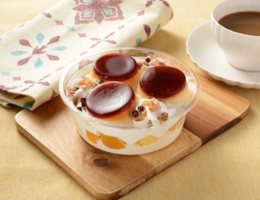 カスタードクリームにスポンジや黄桃、白桃をのせ、さらにその上にクリームとプリン3個をトッピング。