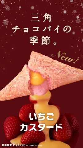 マクドナルド各店で、新作スイーツ「三角チョコパイ いちごカスタード」が11月8日より販売される。180円~(税込)。