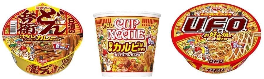 日清夏めんトリオ「カップヌードル 旨辛カルビ味焼そば」「日清の汁なしどん兵衛 スパイシーカレー焼うどん」「日清焼そばU.F.O. お好み焼味焼そば」