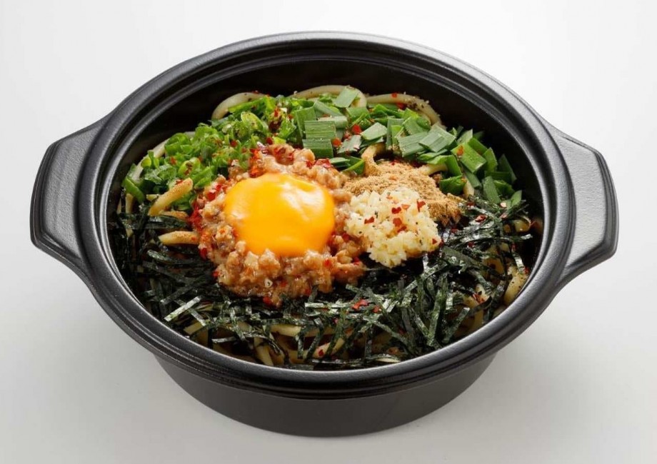 もちもちの太麺に台湾ミンチ、ニラ、ねぎ、白すりごま、鯖粉末、のり、卵黄風ソースをトッピング。味の変化を楽しめるよう、昆布酢が別添えされている。