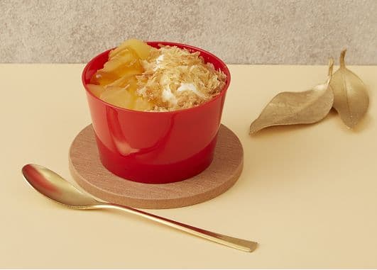 クラッシュパイの上にスポンジ生地、りんご果肉入りのりんごソース、カスタードクリームを重ね、2サイズにダイスカットしたりんご、ホイップクリーム、カラメルりんごソース、クラッシュパイをトッピング。シャキッとしたりんごの食感と甘みを楽しめる。