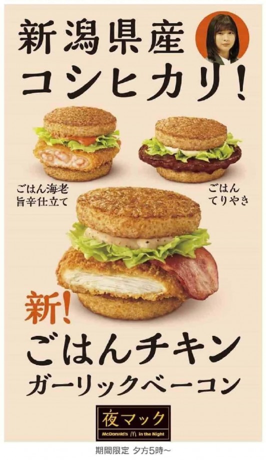 マクドナルドで、夕方5時からの夜マックの期間限定メニューとして、新潟県産コシヒカリを100%使用した新商品「ごはんチキン ガーリックベーコン」が6月29日に発売される。過去にも登場した「ごはん海老 旨辛仕立て」と「ごはんてりやき」も同時にラインアップ。