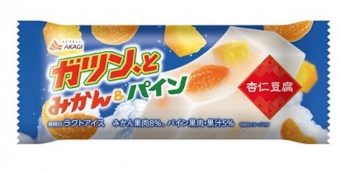 赤城乳業から、新商品「ガツン、と みかん&パイン 杏仁豆腐」が、6月13日より販売されている。162円(税込)。