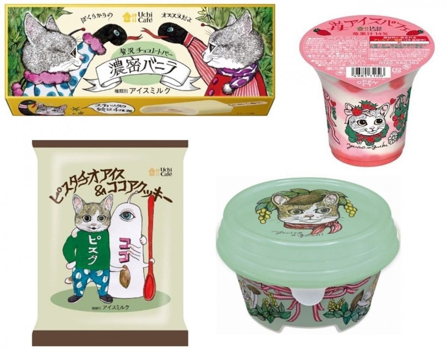 ローソン「Uchi Cafe ピスタチオアイス&ココアクッキー」「Uchi Cafe贅沢チョコレートバー濃密バニラ」「Uchi Cafe苺アイスパフェ」ヒグチユウコさんのデザイン! (参考記事: えん食べ)