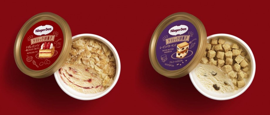 ハーゲンダッツ ミニカップ クラシック洋菓子「ナポレオンパイ~苺とカスタードのパイ~」と「レーズンバターサンド」が3月15日から期間限定で販売されている。319円(税込)。