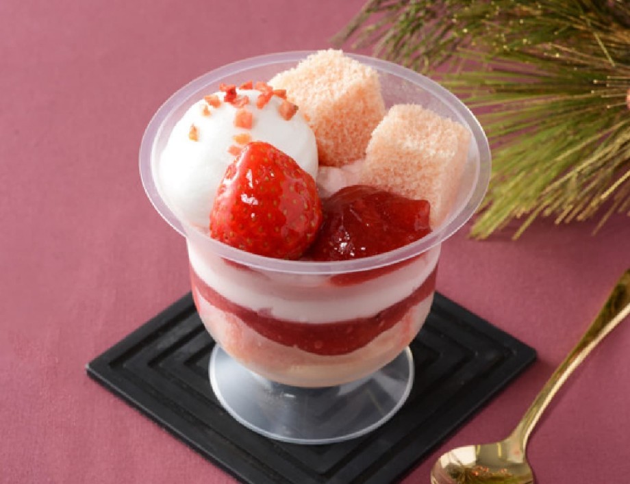 いちご風味のスポンジにいちごソース、苺、ストロベリーピースが盛り付けられたストロベリーパフェ。