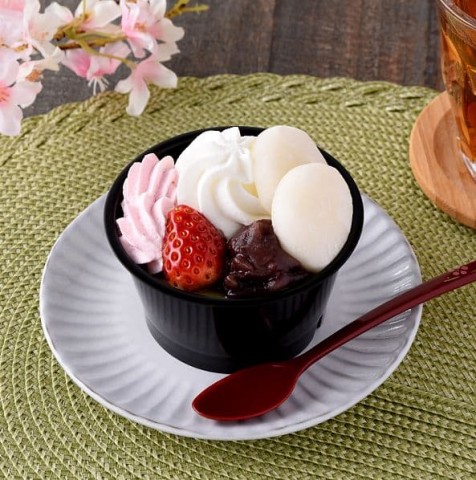 春らしい色合いの和パフェ。黒蜜を染み込ませたスポンジと抹茶ムースに、フレッシュ苺や北海道産小豆の粒あん、お餅、ホイップクリームをトッピング。
