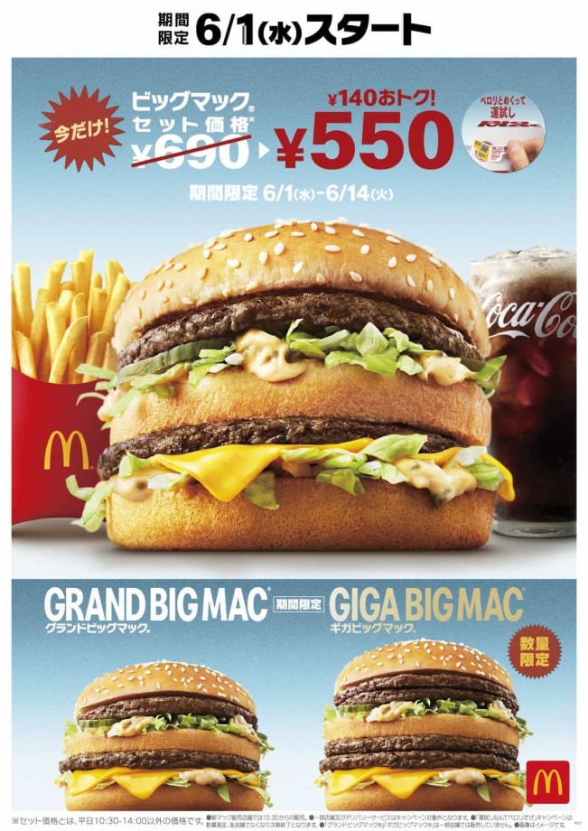 「ビッグマック」のバリューセットが通常価格690円(税込)のところ550円で販売される。