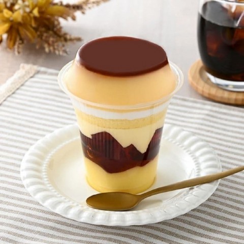プリンを丸ごと1個のせたプリンづくしのパフェ。カスタードプリンの上にカラメルゼリー、プリンムース、スポンジ、ホイップクリームを重ね、その上にカスタードプリンをトッピング。