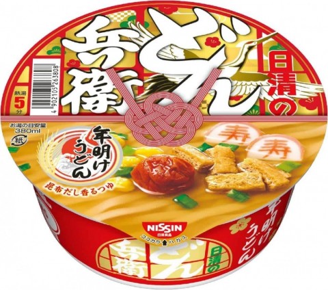 「日清のどん兵衛 年明けうどん」!--紅い梅干しや“寿かまぼこ”入り