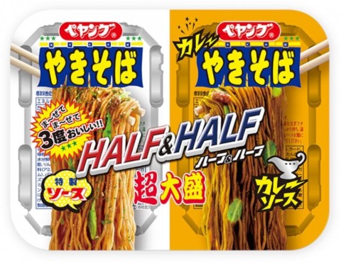 ペヤング「超大盛やきそばハーフ&ハーフカレー」!-- 2種のソース入り