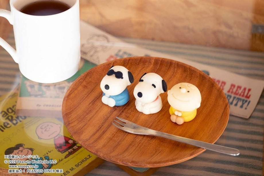 「スヌーピー」、サングラス姿が凛々しい「ジョー・クール」、「チャーリー・ブラウン」を練り切りで表現した和菓子。