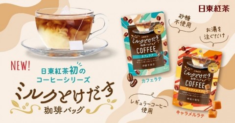 日東紅茶から、初となるコーヒー商品「日東紅茶 ミルクとけだす珈琲バッグ カフェラテ 4袋入り」「日東紅茶 ミルクとけだす珈琲バッグ キャラメルラテ 4袋入り」が8月28日より販売されている。各350円(税別)。