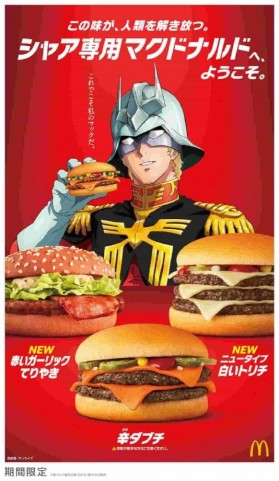マクドナルドにアニメ「機動戦士ガンダム」のキャラクター「シャア・アズナブル」とのコラボレーション「シャア専用マクドナルド」が開催される。6月22日~7月下旬にコラボメニューが取り扱われる。