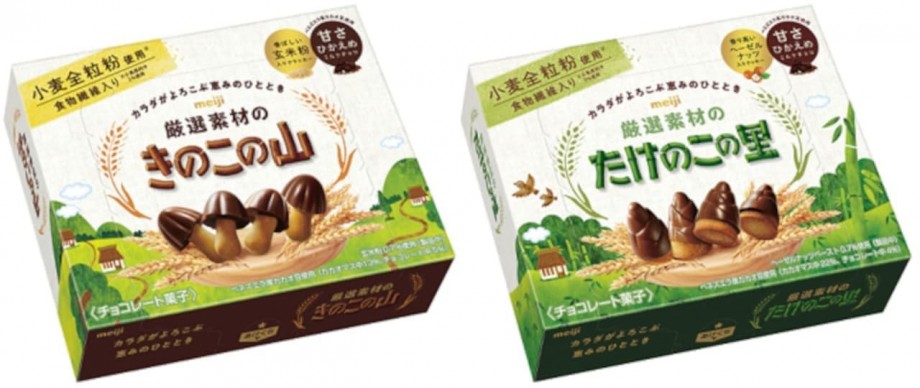 明治から、「厳選素材のきのこの山」「厳選素材のたけのこの里」が3月22日から販売される。