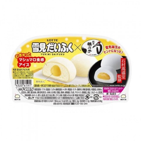 「鶴乃子」をイメージした黄味あんをセンターに入れ、むぎゅっとしたマシュマロ食感のアイスとおもちで包み込むことで、「鶴乃子」の味わいを表現した「雪見だいふく」となっている。