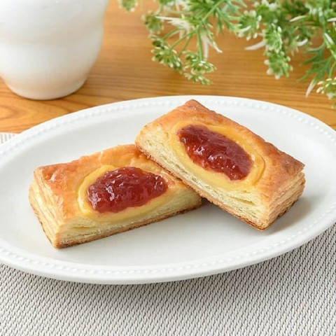 デニッシュ生地にカスタードクリームを絞って焼き上げ、イチゴジャムをトッピングして仕上げた菓子パン。