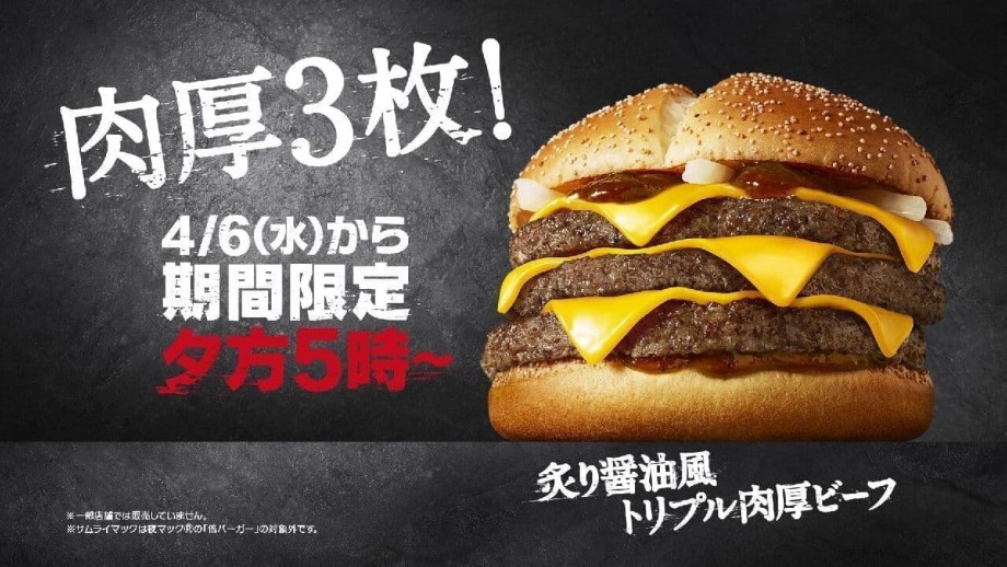 マクドナルドで、「炙り醤油風 トリプル肉厚ビーフ」が発売される。4月6日より、2週間の期間限定かつ17時からのディナー時間帯限定。
