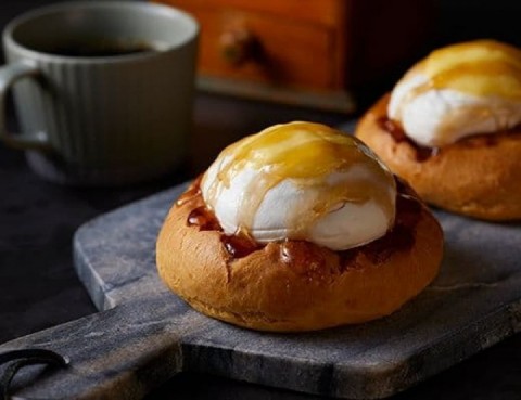 シュー生地の中にホットケーキが入った新感覚のシュークリーム。ホットケーキ生地の上に北海道産生クリームを使用したホイップクリームとバター風クリーム、メープルソースをトッピング。