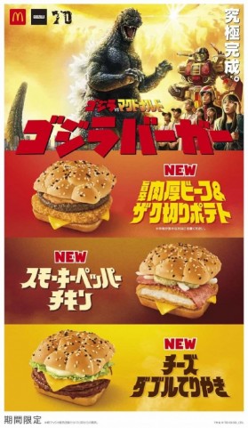 マクドナルド×ゴジラ コラボ第2弾「旨辛肉厚ビーフ&ザク切りポテト」「スモーキーペッパーチキン」「チーズダブルてりやき」の3種類! (参照記事: えん食べ)