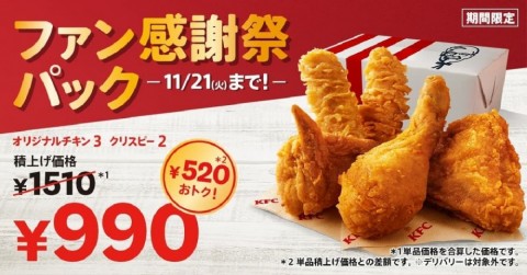 ケンタッキーフライドチキン(KFC)各店で、「ファン感謝祭パック」が10月25日~11月21日に販売されている。
