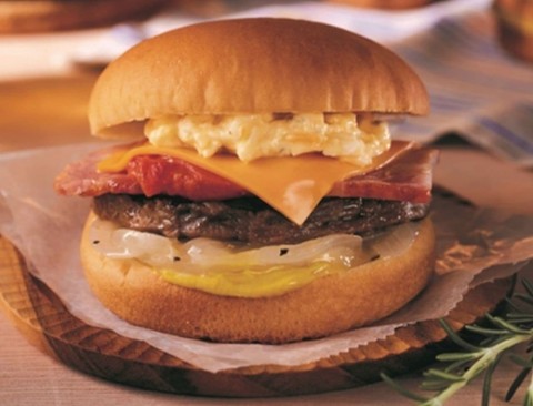 具材にはビーフパティ、ベーコン、塩だれを加えて炒めたオニオン、チェダーチーズを重ね、たまご感のあるタルタルソースとすりおろし野菜ソース入りのケチャップ、マスタードをプラス。肉の旨みとさまざまなソースが味わえる。