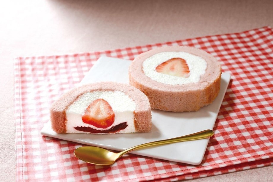 いちごペーストを混ぜ込んだ生地でミルククリームを巻いたロールケーキ。クリームの中には甘酸っぱいベリーソースを入れ、いちごをトッピング。