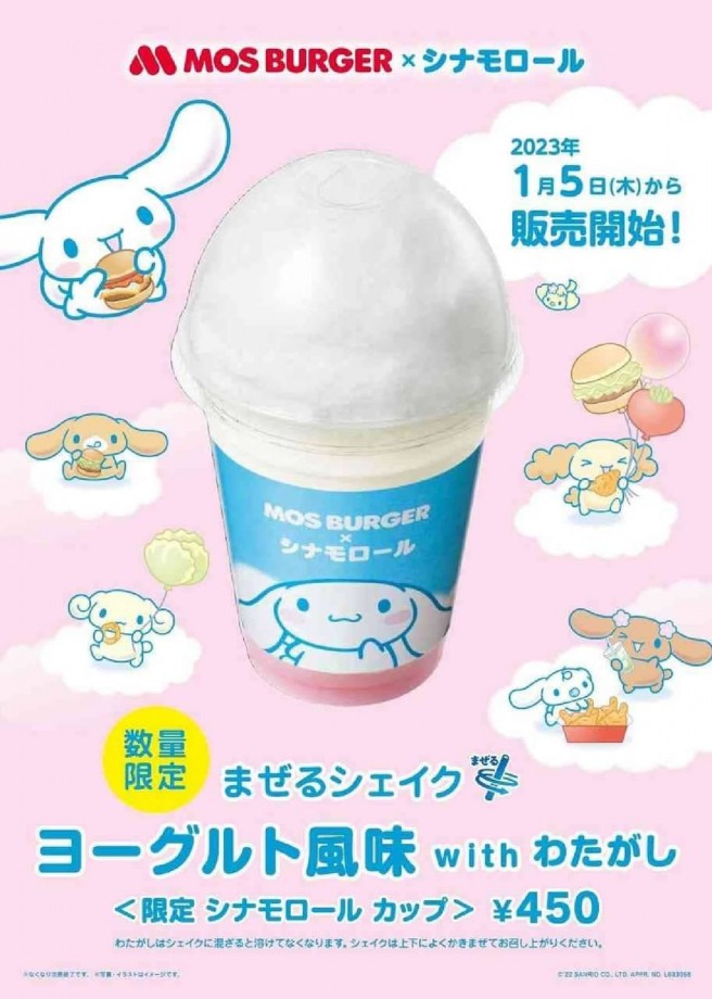 モスバーガーで「まぜるシェイク ヨーグルト風味 with わたがし<限定 シナモロール カップ>」が、1月5日から販売される。30万食限定、期間限定。450円(税込)。