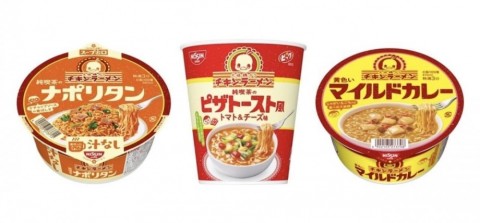 「チキンラーメン汁なしどんぶり 純喫茶のナポリタン」「チキンラーメンビッグカップ 純喫茶のピザトースト風 トマト&チーズ味」「チキンラーメンどんぶり 黄色いマイルドカレー」日清から (参考記事: えん食べ)