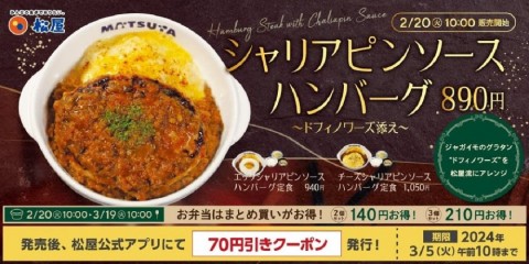 松屋から、新メニュー「シャリアピンソースハンバーグ定食」が2月20日より販売される。