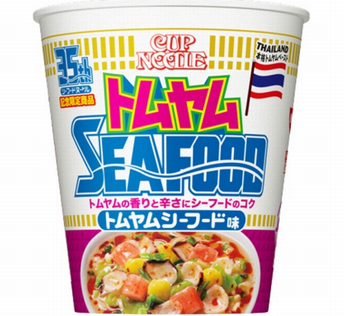 「シーフード」と「トムヤムクン」、混ぜたらうまかったので商品化したという。シーフードヌードル35周年記念限定商品。