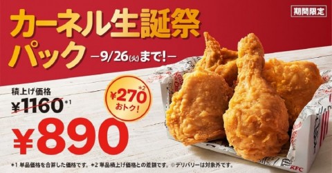 9月9日は、ケンタッキーフライドチキン(KFC)創業者であるカーネル・サンダースの誕生日。これに合わせ、全国の店舗で「カーネル生誕祭パック」が8月23日~9月26日に販売される。また、サイドメニューをお得に楽しめる“追加でおトク”も。