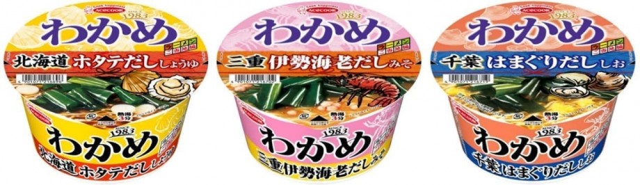 エースコック「わかめラーメン 北海道 ホタテだししょうゆ」「わかめラーメン 三重 伊勢海老だしみそ」「わかめラーメン 千葉 はまぐりだししお」 (参考記事: えん食べ)