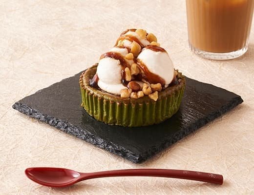 宇治抹茶エスプレッソ&宇治抹茶パウダー入りのバスク風チーズケーキ。ホイップクリームとくるみ、黒糖入り黒蜜ソースをトッピングし、底面は黒糖カラメルでコク深い味わいに仕上げている。