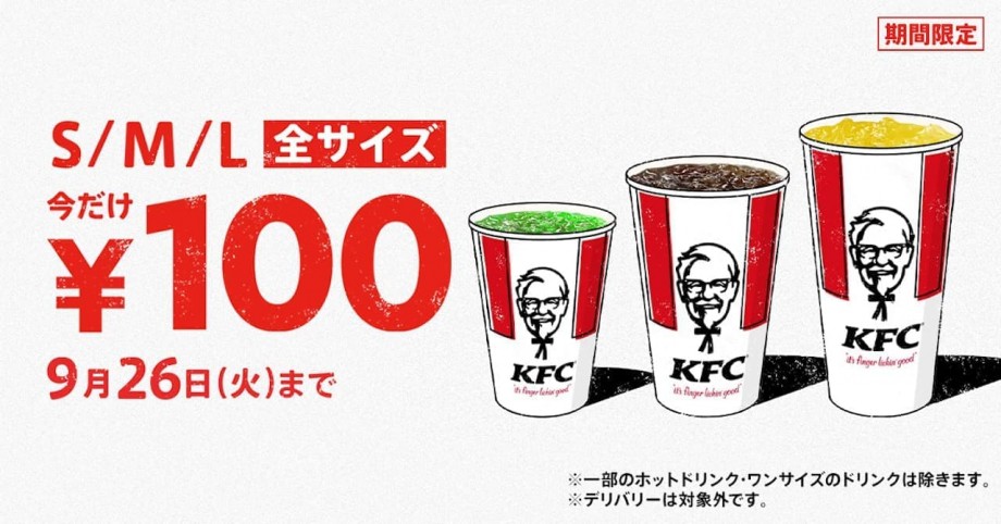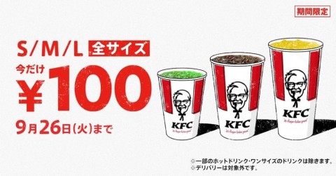 ケンタッキーフライドチキン(KFC)で、「ドリンク全サイズ100円」キャンペーンが実施される。実施期間は9月13日〜9月26日までの2週間。