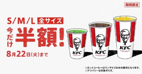ケンタッキーフライドチキン(KFC)各店で、「ドリンク全サイズ半額」キャンペーンが8月2日~8月22日の3週間限定で実施される。