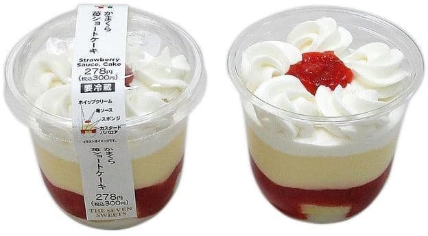 カップで楽しめるショートケーキ。バニラ香るカスタードババロア、甘ずっぱいいちごソース、しっとり食感のスポンジケーキ、口どけのよいホイップクリームを組み合わせている。